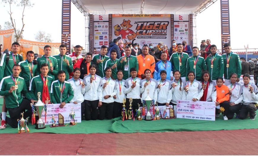 दोस्रो संस्करणको ‘टाइगर कप आमन्त्रित खुला महिला तथा पुरुष भलिबल’ प्रतियोगितामा पुरुषतर्फ त्रिभुवन आर्मी क्लब र महिलातर्फ सशस्त्र प्रहरीको एपीएफ क्लबले उपाधि जितेका छन् ।