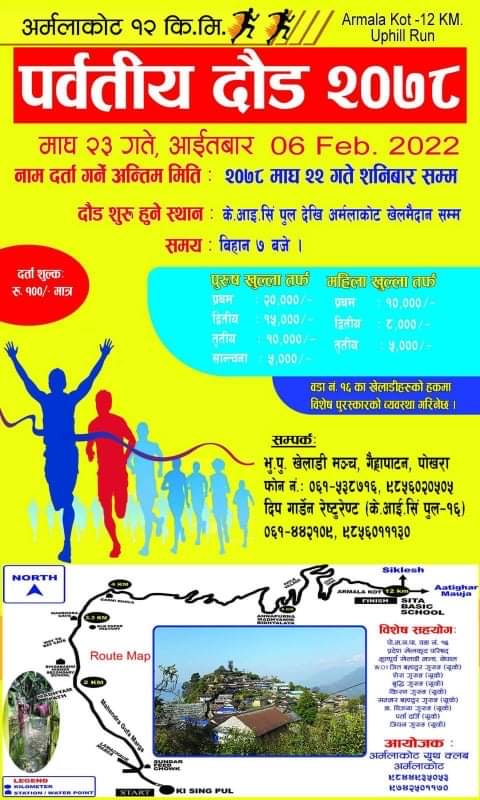 पोखरा । माघ २०, संधैका बर्ष झैं यस पटक पनि पोखराको केआईसिंहपुल देखि अर्मलाको खेल मैदान सम्म करिब १२ कि.मि को पर्वतिय दौड प्रतियोगिता हुने भएको छ ।