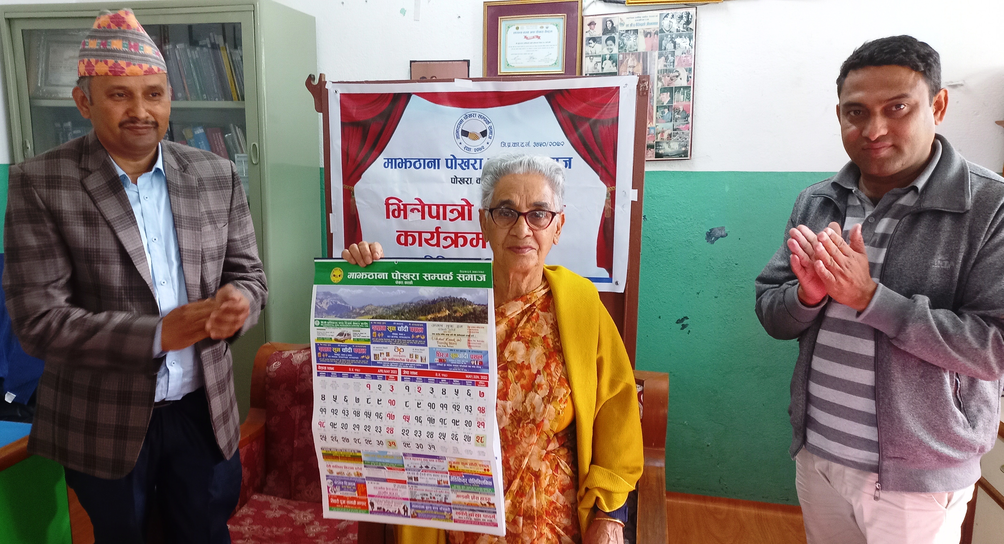 समाजका संरक्षक एवम् जेष्ठनागरिक गंगादेवी लामिछानेले पोखरामा आयोजित एक समारोहका बीच भित्तेपात्रो लोकार्पण गर्दै नयाँ बर्षले सवैमा सुख, शान्ति,समृद्धि, सुस्वास्थ्य र दिर्घायुको कामना गर्नुभयो ।