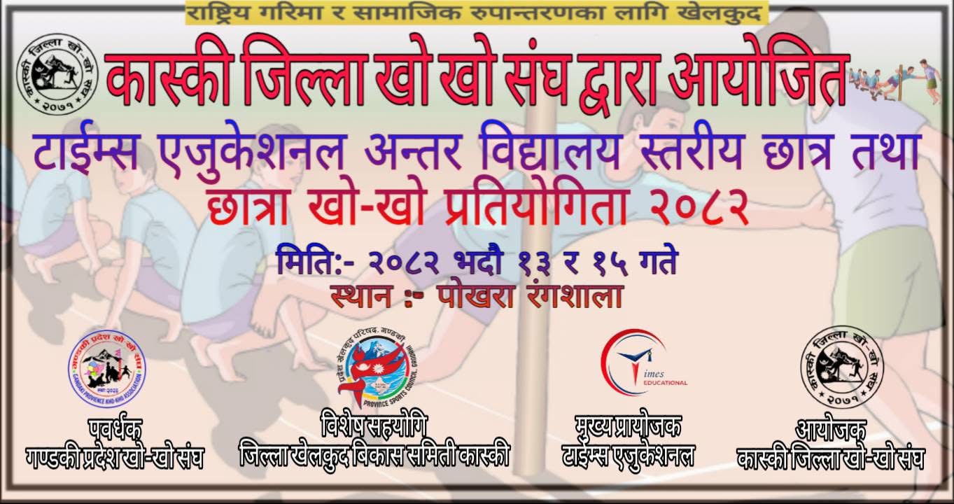 पोखरा । कास्की जिल्ला खो-खो संघको आयोजनामा तथा टाइम्स एजुकेशनलको मुख्य प्रायोजनमा पोखरामा अन्तरविद्यालय स्तरीय खो-खो प्रतियोगिता आयोजना हुने भएको छ।