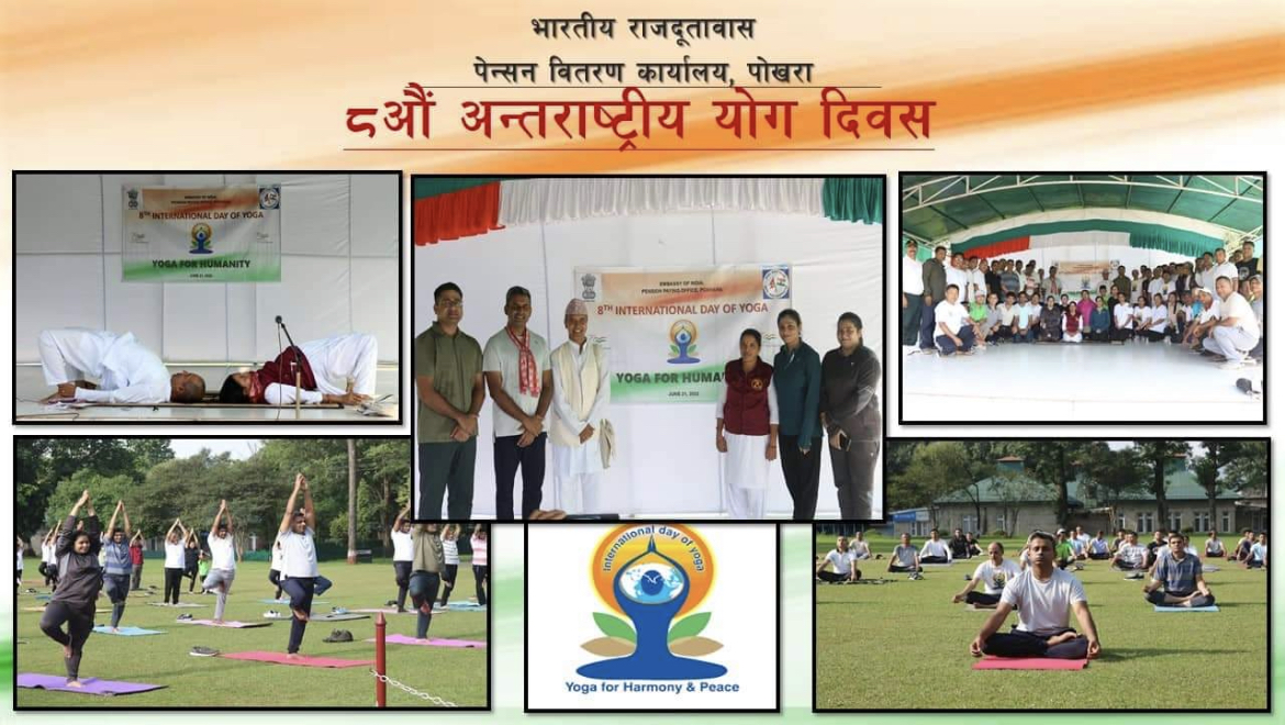 पोखरा । असार ७, भारतिय राजदुतावास पेन्सन बितरण कार्यालय पोखराको हाता भित्र आज ७५ आजादि को अमृत महोत्सव कार्यक्रम र ८ औं अन्तराष्ट्रिय योग दिवसको मनाईएको छ ।