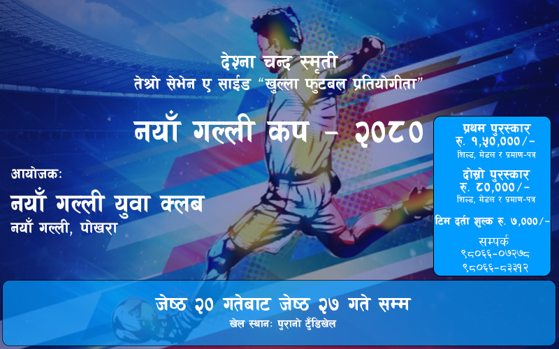 पोखरा महानगरपालिका १ स्थित नयाँ गल्ली युवा क्लबको आयोजनामा जेठ २० देखि २७ गतेसम्म तेस्रो संस्करणको देश्ना चन्द स्मृति सेभेन ए साइड खुल्ला फुटबल प्रतियोगिता हुने आर्थिक संयोजक हिटलर घलेले जानकारी दिए ।