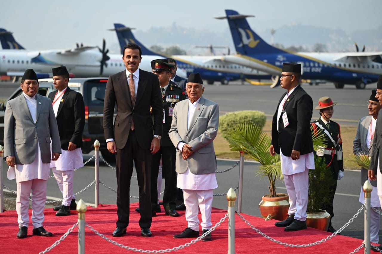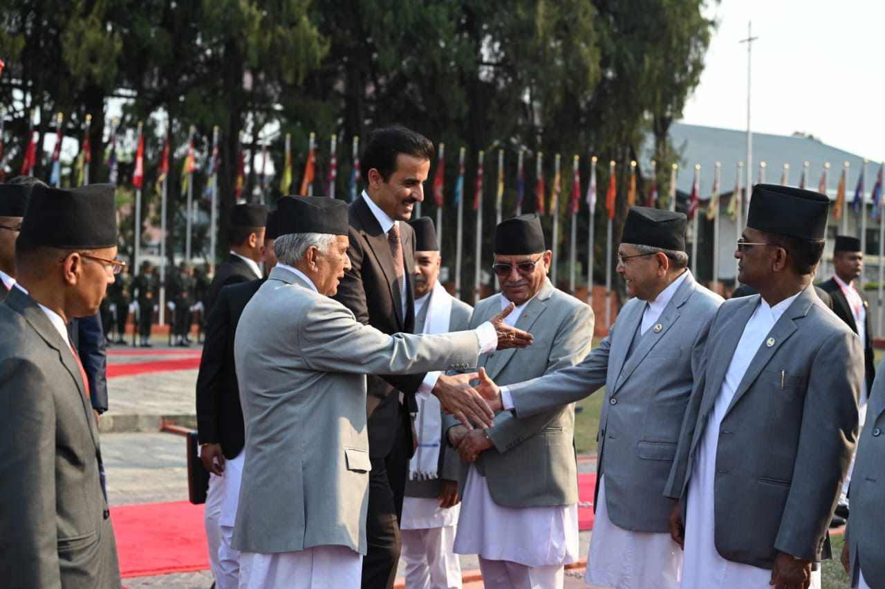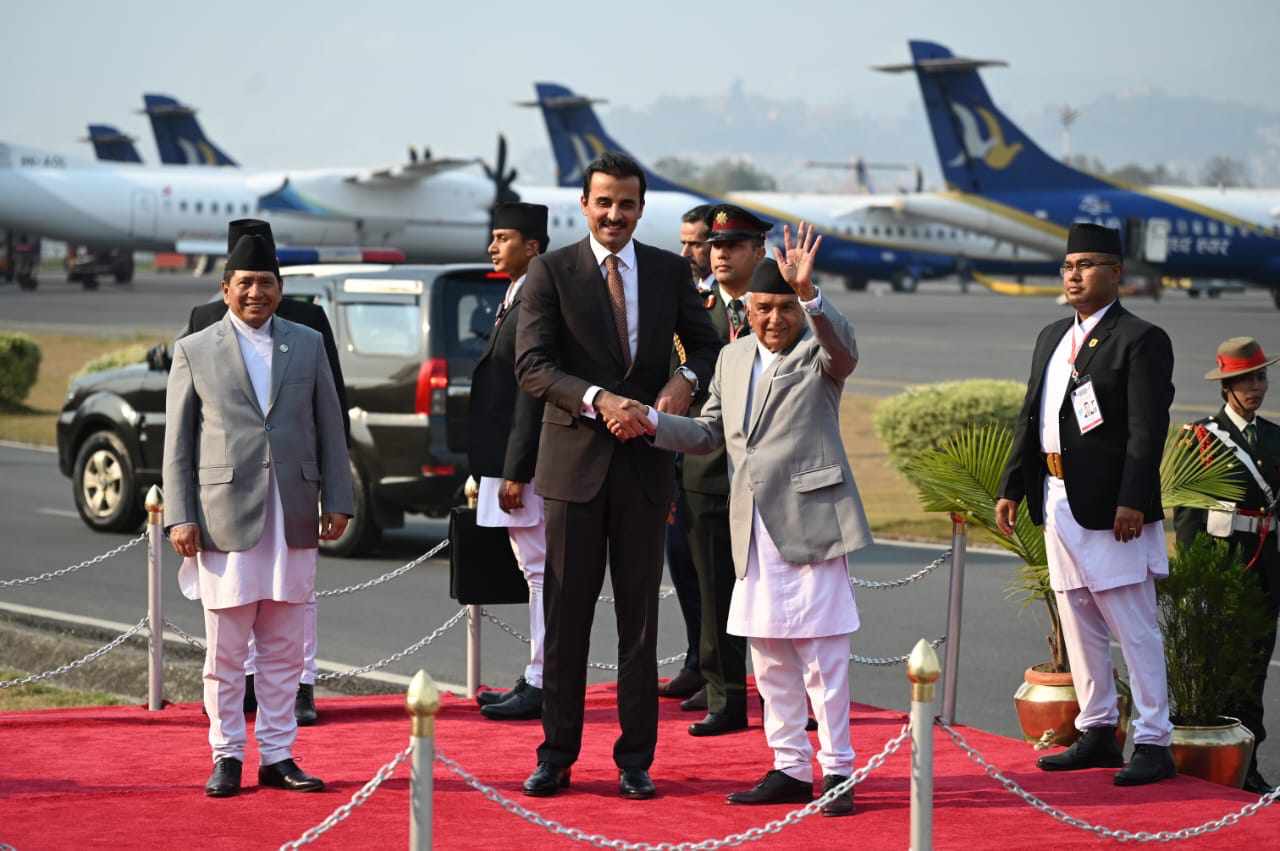 काठमाडौँ । राष्ट्रपति रामचन्द्र पौडेलको मैत्रीपूर्ण निमन्त्रणामा कतारका अमिर ( राजा ) शेख तमिम विन हमाद अल थानी नेपालको दुई दिने राजकीय भ्रमणमा मङगलबार अपरान्ह नेपाल आइपुग्नुभएको छ ।