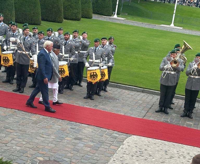 वर्लिन, जर्मनी । जर्मन भ्रमणमा रहनुभएका राष्ट्रपति रामचन्द्र पौडेललाई सोमबार बर्लिनमा जर्मन सरकारले गार्ड अफ अनरको सम्मान दिएको छ । राष्ट्रपति पौडेल र जर्मनीका राष्ट्रपतिबीच द्धीपक्षीय भेटवार्ता हुनु अघि सो सम्मान दिइएको राष्ट्रपतिका प्रेस सल्लाहकार किरण पोखरेलले जानकारी दिनुभयो ।