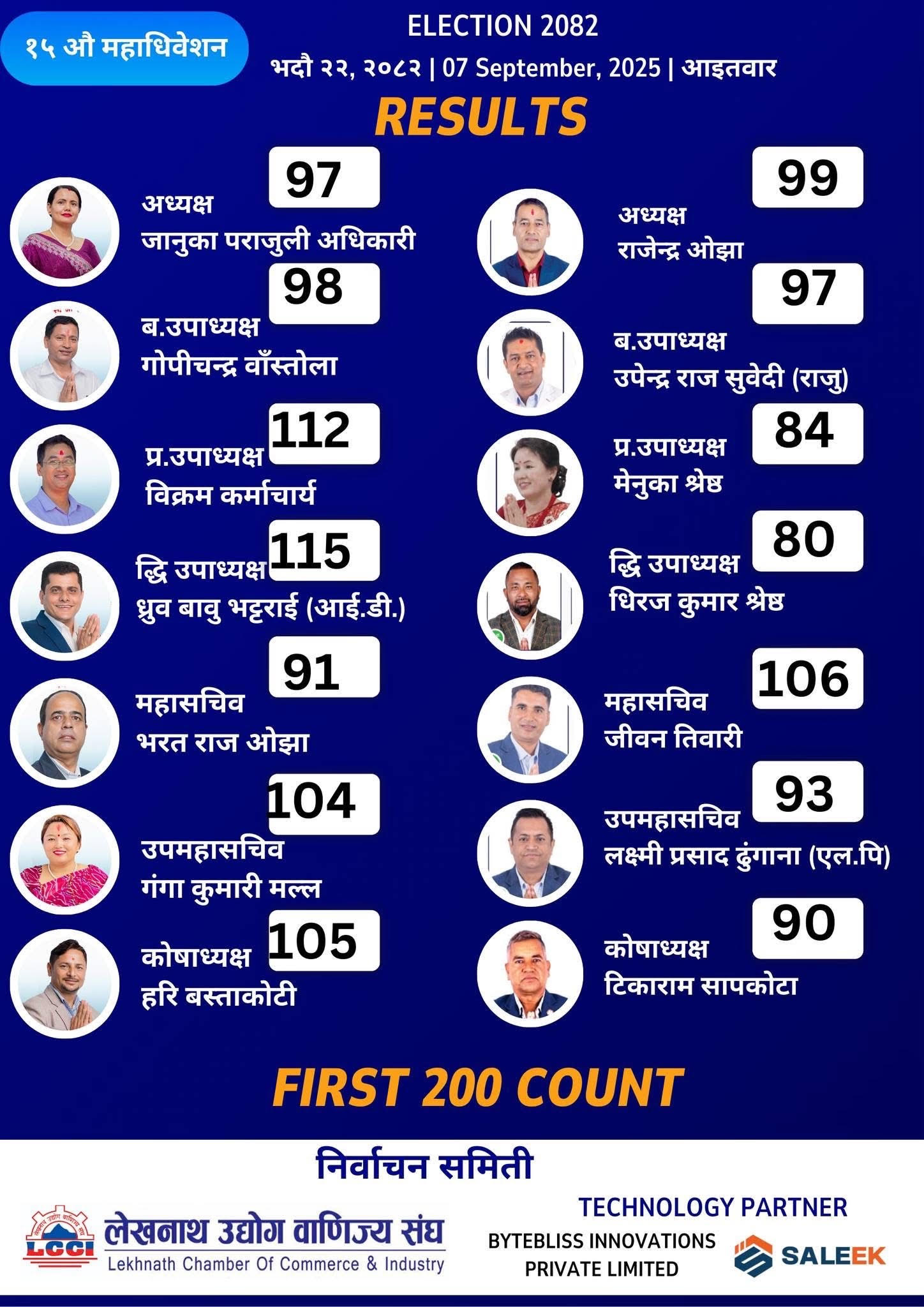 पोखरा, लेखनाथ उधोग बाणिज्य संघको निर्बाचनको मत गणना अनुसार २ सय मत गणना हुंदा अध्यक्षका उमेदवार राजेन्द्रले जानुकालाई २ मतले पछाडी पारेका छन भने महासचिबमा पनि राजेन्द्रको प्यानलका जिबन तिवारीले जानुका प्यानलका भरतराज ओझालाई १५ मतले पछाडी पारेका छन। बरिष्ठ उपाध्यक्षमा जानुका प्यानलका गोपिचन्द्र १ मतले आफ्ना प्रतिद्वन्दी उपेन्द्रराज सुबेदी भन्दा आगाडी छन । मतगणनाको परिणाम यस प्रकार छ ।