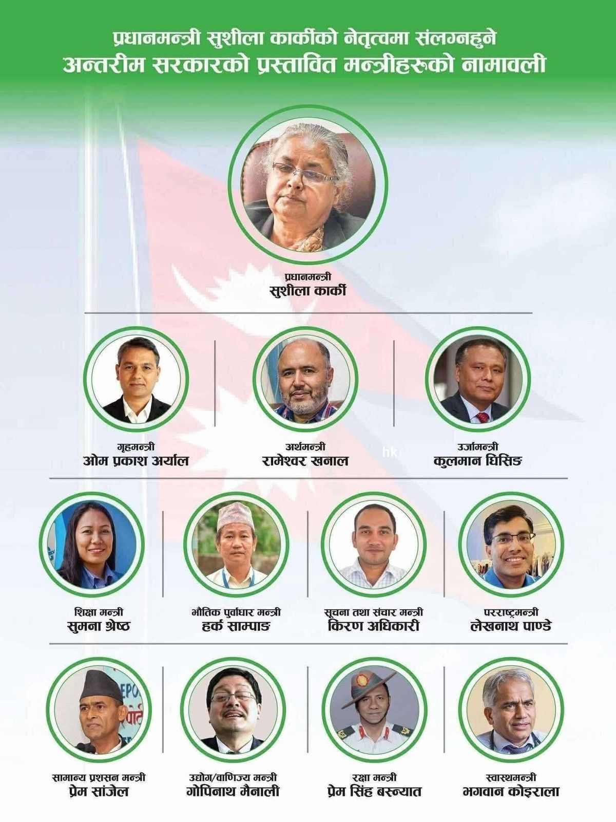पोखरा, नवनियुक्त प्रधानमन्त्री सुशीला कार्कीले आइतबार साँझ आंफ्नो नेतृत्वमा रहेको मन्त्रिपरिषद् विस्तार गर्नुभएको छ । जस अनुसार नेपाल विद्युत् प्राधिकरणका पूर्व कार्यकारी निर्देशक कुलमान घिसिङलाई ऊर्जा जलश्रोत तथा सिँचाई मन्त्रालयको जिम्मेवारी दिइएको छ ।