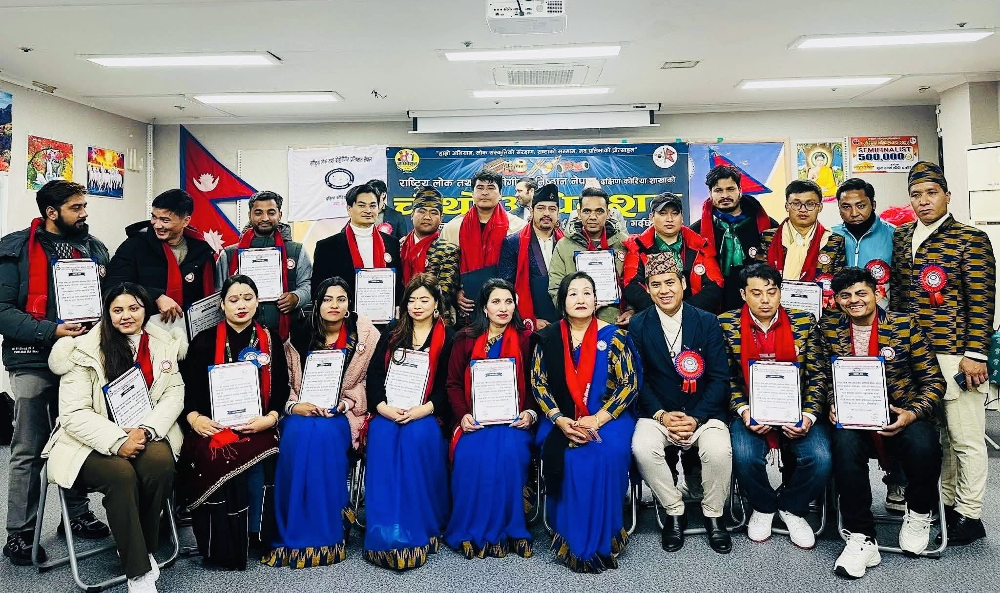 कोरिया । नेपालबाट दक्षिण कोरिया गई बिभिन्न पेशामा आबद्द रही लोक दोहोरी तथा नेपाली कला संस्कृतिमा कृयाशिल महानुभावहरु रहनुभएको राष्ट्रिय लोक तथा दोहोरी गीत प्रतिष्ठान नेपाल दक्षिण कोरिया शाखाको चौथो अधिवेशन सम्पन्न भएको छ ।