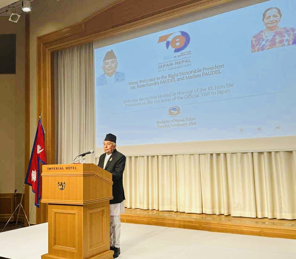 जापान ( टोकियो ) । राष्ट्रपति रामचन्द्र पाैडेलले जापानमा बस्ने नेपालीहरूले नेपाली अर्थतन्त्रलगायत नेपालको सामाजिक विकासमा महत्वपूर्ण योगदान पु¥याइरहेको धारणा व्यक्त गर्नुभएको छ । जापानको औपचारिक भ्रमणमा रहनुभएका राष्ट्रपति पौडेलले नेपाली राजदूतावासद्वारा आज यहाँ आयोजित स्वागत समारोहलाई सम्बोधन गर्दै सो धारणा व्यक्त गर्नुभएको हो ।