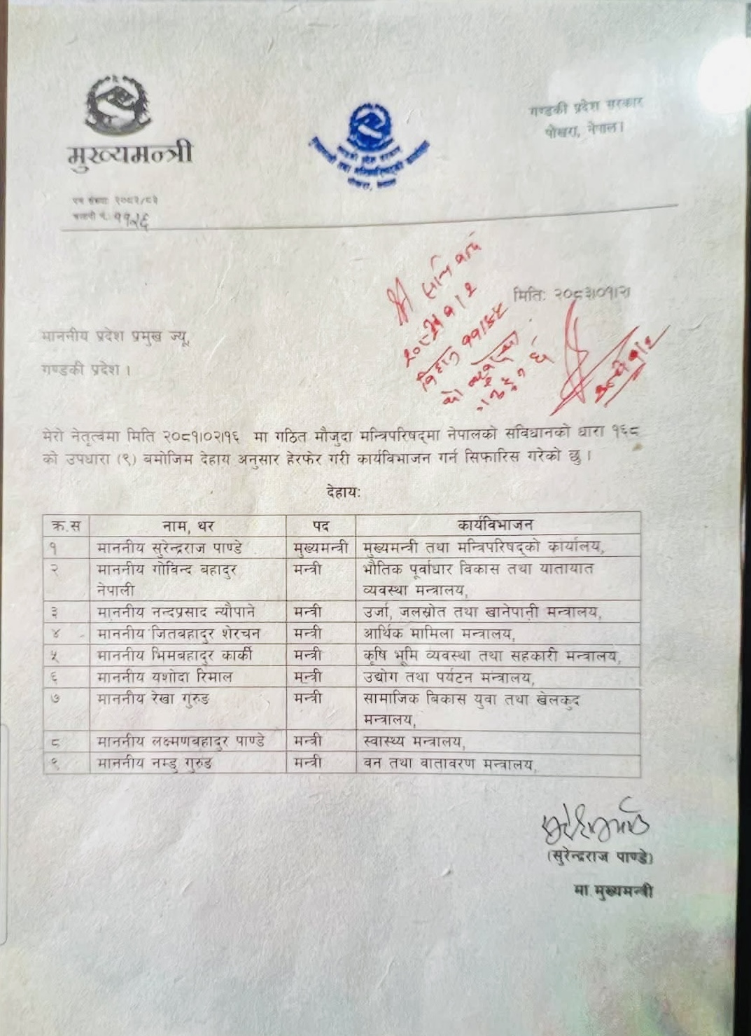 पोखरा, सुरेन्द्रराज पाण्डे नेतृत्वमा रहेको गण्डकी प्रदेश सरकारमा मन्त्रीहरुको फेरबदल भएको छ। नयाँ बर्षको आगमनसंगै प्रदेश सरकारमा नयाँ मन्त्रीहरुको चयन पछि प्रदेश सरकारको काम कारबाहीलाई थप प्रभावकारी बन्ने अपेक्षा गरिएको छ । नयाँ मन्त्रीहरुको शपथ आज बुधबार भएको छ।